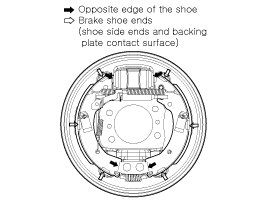 11. Apply brake cylinder grease or equivalent rubber grease to the brake shoe ends and opposite edges of the shoes shown. Don't get grease on the brake linings.