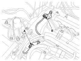 7. Disconnect the intake OCV (Oil control valve) connector (A) and the exhaust OCV (Oil control valve) connector (B).