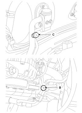 Recovery/Recycling/Charging System (A) to the high-pressure service port (B) and the low-pressure service port (C) as shown, following the equipment manufacturer's instructions.
