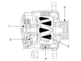 The alternator is regulated by the battery voltage detection system. The main components of the alternator are the rotor, stator, rectifier, capacitor brushes, bearings and V-ribbed belt pulley. The brush holder contains a built-in electronic voltage regulator.