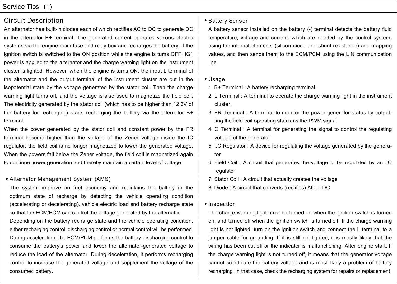 Alternator management system controls the charging voltage set point in order to improve fuel economy, manage alternator load under various operating conditions, keep the battery charged, and protect the battery from over-charging. ECM controls generating voltage by duty cycle (charging control, discharging control, normal control) based on the battery conditions and vehicle operating conditions.
