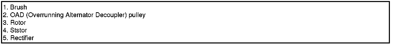 The alternator is regulated by the battery voltage detection system. The main components of the alternator are the rotor, stator, rectifier, capacitor brushes, bearings and OAD (Overrunning Alternator Decoupler) pulley. The brush holder contains a built-in electronic voltage regulator.