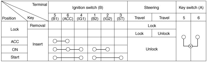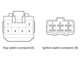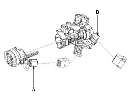 1. Disconnect the ignition switch connector (B) and key switch connector (A) from under the steering column.