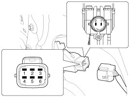 3. Connect the motor terminals No.1 and No.2 directly to battery voltage (12V) and connect the motor terminals No.6 directly to battery (-). And then check that the motor operates smoothly. If the operation is abnormal, replace the motor.