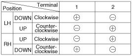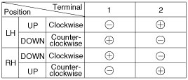 3. Connect the motor terminals directly to battery voltage (12V) and check that the motor operates smoothly. Next, reverse the polarity and check that the motor operates smoothly in the reverse direction. If the operation is abnormal, replace the motor.