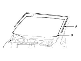 4. Install windshield side molding (A) on the windshield glass (B).