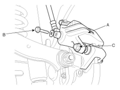 1. Remove the brake hose bolt (B) and the guide rod bolts (C) from the caliper assembly (A).