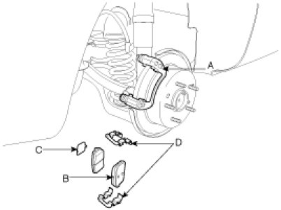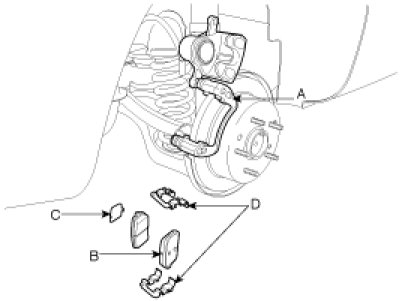 3. Remove the pads (B), the pad shims (C) and the pad retainers (D) from the caliper bracket (A).