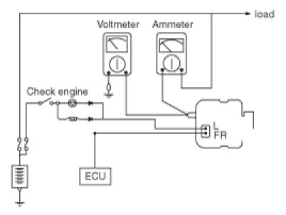 1. Check to see that the voltmeter reads as the same value as the battery voltage. If the voltmeter reads 0V, and the open circuit in the wire between alternator "B" terminal and battery (+) terminal or poor grounding is suspected.