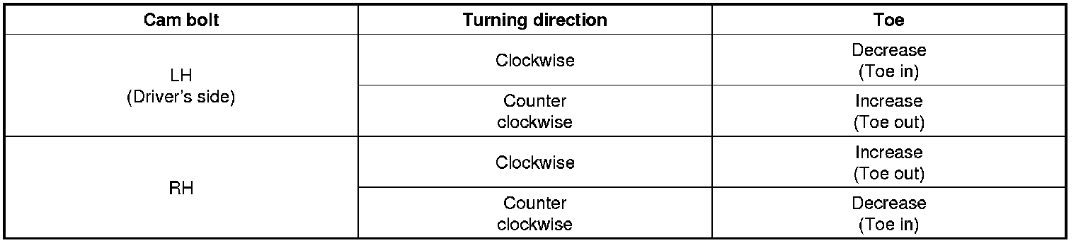 Camber is pre-set at the factory, so it does not need to be adjusted. If the camber is not within the standard value, replace or repair the damaged parts and then inspect again.
