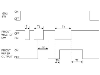 (1) In state of IGN2 SWITCH ON, when FRONT WASHER SWITCH is ON for more than T4 s(0.6s), then after T5's(0.3s), WIPER output is ON, and after WASHER SWITCH is OFF and WIPER output is ON for T6 (3's, the time for operating WIPER 2 - 3 times), and then WIPER output is OFF.