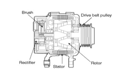 The alternator is regulated by the battery voltage detection system. The main components of the alternator are the rotor, stator, rectifier, capacitor brushes, bearings and V-ribbed belt pulley. The brush holder contains a built-in electronic voltage regulator.
