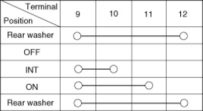 1. With the rear wiper & washer switch in each position, make sure that continuity exists between the terminals below. If continuity is not as specified, replace the multifunction switch.