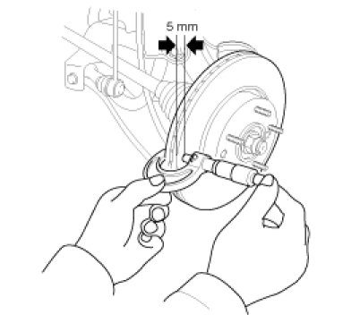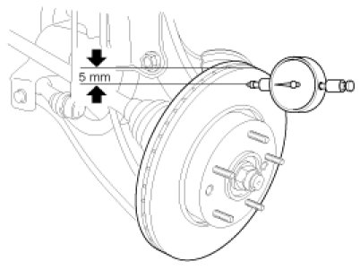 1. Place a dial gauge about 5mm (0.2 in.) from the outer circumference of the brake disc, and measure the runout of the disc.