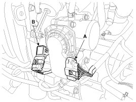 5. Disconnect the ETC (Electronic throttle control) connector (A) and the MAPS (Manifold absolute pressure sensor) & IATS (Intake air temperature sensor) connector (B).