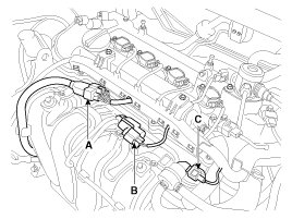 4. Disconnect the injector extension connector (A), the VIS (Variable intake system) connector (B) and the PCSV (Purge control solenoid valve) connector (C).