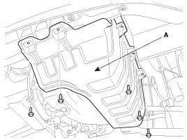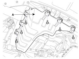 2. Remove the dust cover (A) and unfasten the transaxle mounting bolt (B).