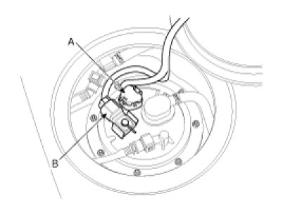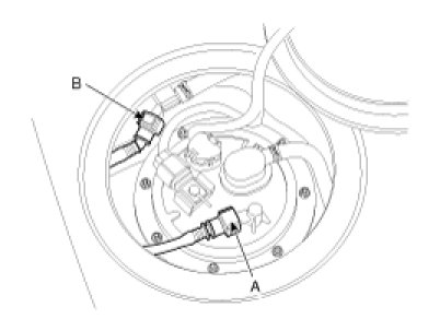 (3) Disconnect the fuel pump connector (A) and the fuel tank pressure sensor connector (B).