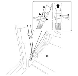 3. To remove the seat belt anchor pretensioner (C), keep on pushing the lock pins (A) as arrow direction.
