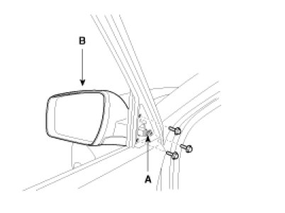 2. After disconnecting the connector (A), remove the outside rear view mirror (B).