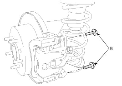 1. Loosen the guide rod bolt (B) and pivot the caliper up out of the way.