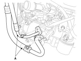 12. Recover the refrigerant and then remove the high pressure pipe and the low pressure pipe (A).