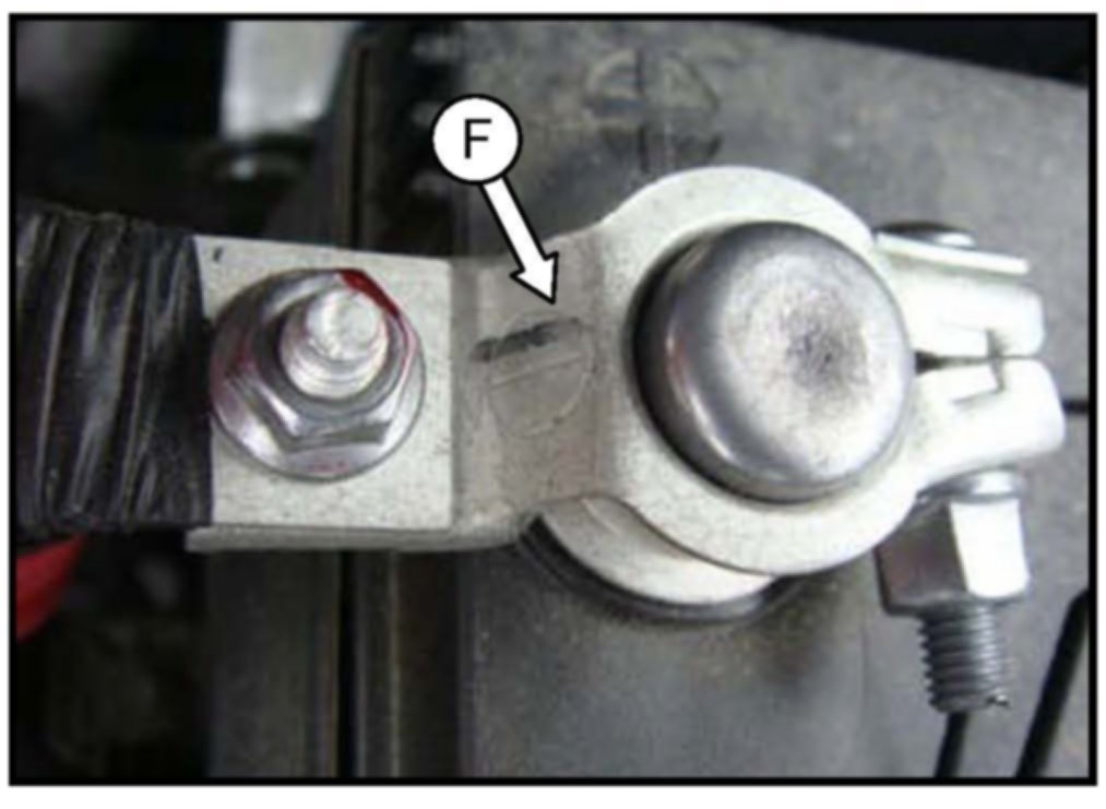 3. Repeat step 2 for the Positive (+) battery cable terminal (F) side.