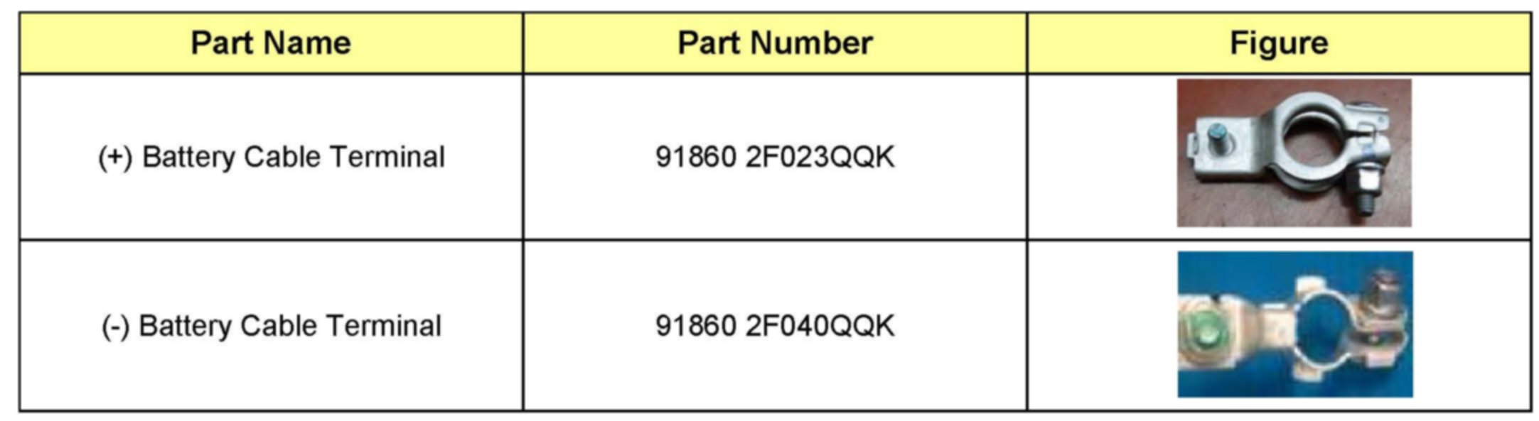 This bulletin provides information relating to the Positive (+) and Negative (-) battery cable terminal replacement on Soul vehicles produced from May 01, 2011 to June 30, 2011. Kia is requesting the completion of this Service Action on all affected 2011/12MY Soul (AM) vehicles prior to delivery. Before conducting the procedure, verify that the vehicle is included in the list of the affected VINs.