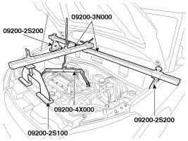 9. Using the engine support fixture (beam No.: 09200-38001 or 09200-3N000, supporter No.:09200-2S100/2S200, adapter No.: 09200-4X000), hold the engine and transaxle assembly safely.