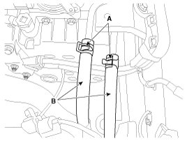 7. Disconnect the hose (B) after removing the automatic transaxle fluid cooler hose clamp (A).