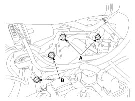 8. Remove the automatic transaxle upper mounting bolt (A-2ea) and the starter motor mounting bolt (B-2ea).