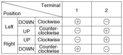 4. Connect the motor terminals directly to a 12 volt battery and check that the motor operates smoothly. Next, reverse the polarity and check that the motor operates smoothly in the reverse direction. If the operation is abnormal, replace the motor.