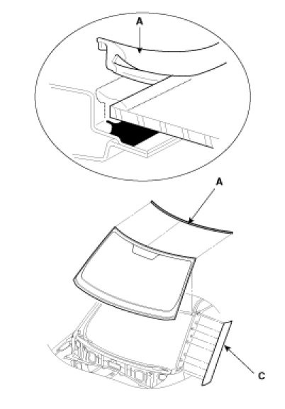 3. Remove the windshield glass upper molding (A).Remove the spacer.
