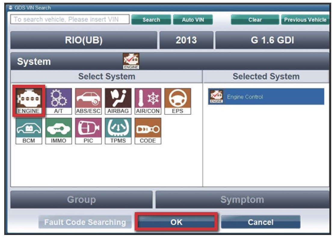 3. Choose "Engine" under "Select System." Click "OK" and follow on screen instructions for connecting to vehicle
