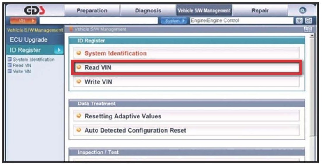 4. To verify the VIN, select "Read VIN" under the "Vehicle S/W Management" menu. Click "OK" and write down the VIN for later entry into form.