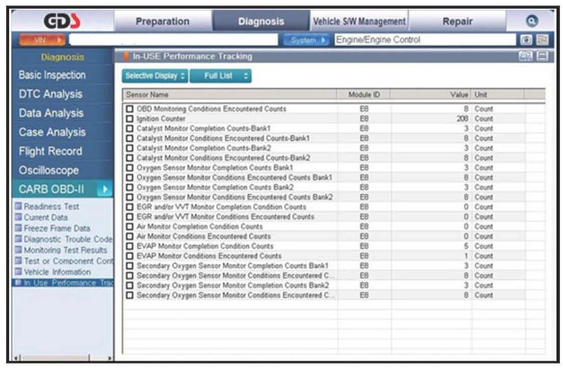 7. Click on "IN USE Performance Tracking" found in the CARB OBD-II list at the bottom left of the screen. Then click the "Expand" button at the top right corner of "IN-USE Performance Tracking" window.