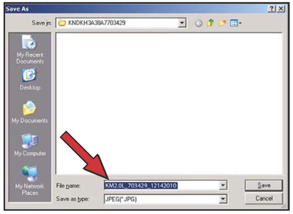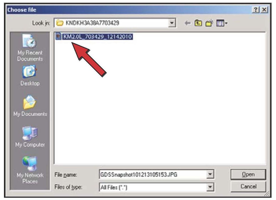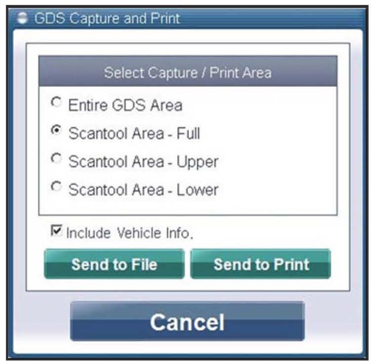 Select "Scantool Area - Full" and click "Send to file." The GDS will set up a designation folder and file name to save the captured data. Please change the file name to include the model/engine, the last 6 digits of the VIN and the date (mmddyyyy)