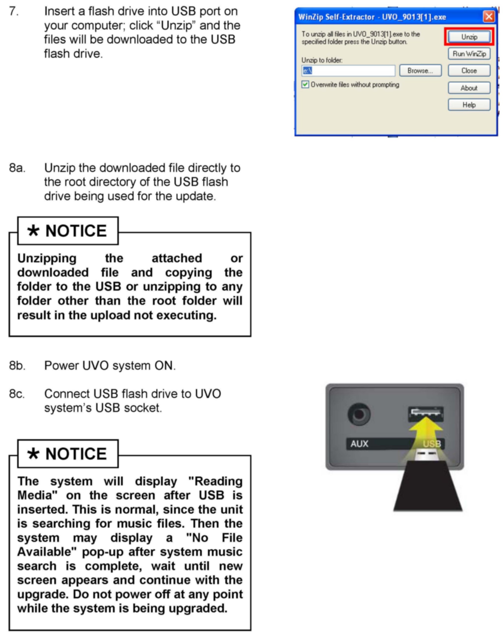 This bulletin provides the procedure for upgrading the 2013MY Optima UVO system. Kia is requesting the completion of this Service Action on all affected 2013MY Optima vehicles prior to delivery. Before conducting the procedure, verify that the vehicle is included in the list of the affected vehicles.