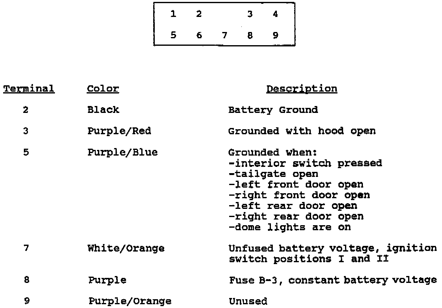 Directly below the steering column is an unused black 9 position plug that provides a central point for door jamb switch connections. The wiring to this connector is as follows: