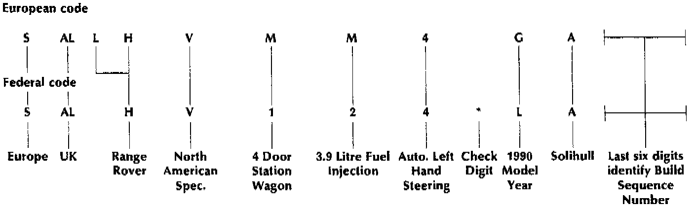 The Federal Vehicle Identification Number consists of similar information to the European number and is made up of a minimum of 17 digits. These numbers are used, to identify manufacturer, model range, specification, body type, engine, transmission/steering, model year, plant and build sequence number and serve to identify the vehicle.