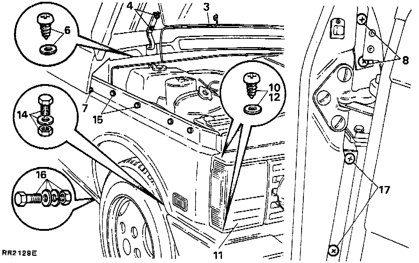 4. Release the four bolts (4) securing the hood to the hinges, note the ground strap located under the upper left hand hood fixing, with assistance lift the hood clear of the vehicle.