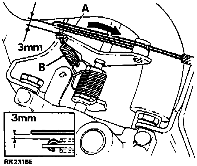 6. With the throttle fully open, check that a gap of at least 3 mm (1/8 in) exists between the side of the actuator link ("A" in illustration) and the side of the small spring which connects the inner throttle level to the outer throttle lever ("B" in illustration). Realign the actuator link by bending to achieve the correct gap if it is less than 3 mm. Recheck the clearance at closed throttle/open throttle and check that the actuator link slides smoothly in the groove of the throttle lever.