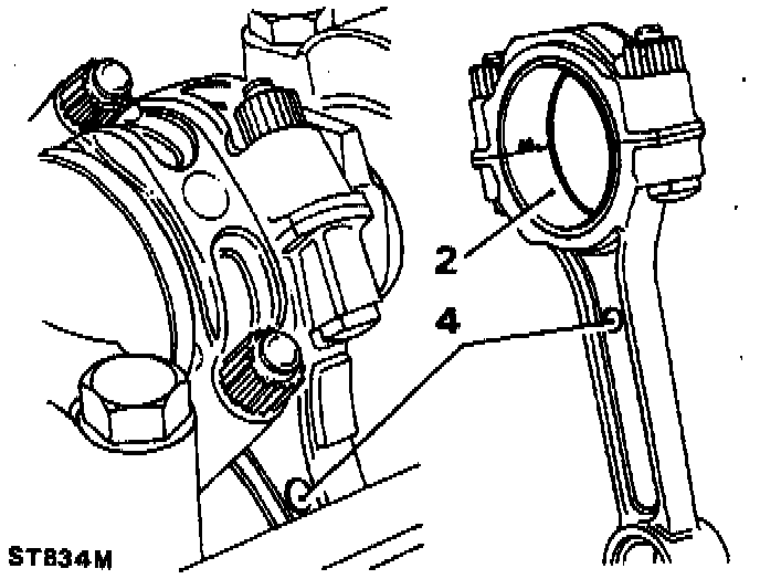10. Locate the cap and shell onto the connecting rod, noting that the rib on the edge of the cap must be towards the front of the engine on the right hand bank of cylinders and towards the rear on the left hand bank.