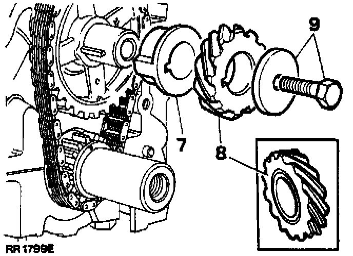 9. Secure the drive gear and camshaft sprocket assembly with the bolt and washer and tighten to 54-61 Nm (40-45 ft lb).