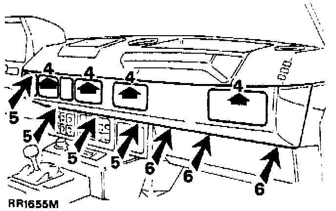 6. Remove the three screws securing the bottom of the panel to the center dash panel. Remove the remaining three screws above the blower motor trim panel.