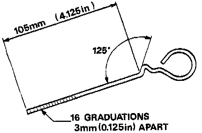The compressor is not fitted with an oil level dipstick, and a suitable dipstick must be made locally from 3 mm (0.125 in) diameter soft wire in accordance with the accompanying illustration. After shaping, mark the end of the dipstick with sixteen graduations 3 mm (0.125 in) apart.