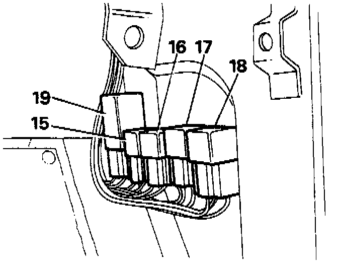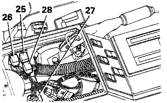 Relays located inside the glove box, accessible by removing the glove box liner. Front (black terminal block) and rear (blue terminal block) window relays (25 and 26) window lift one touch control unit (27). Gear shift illumination relay (28).