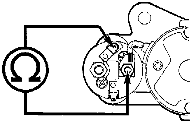 24. Check the contacts by connecting an ohmmeter as shown. Solenoid plunger removed, ohmmeter should read infinity.