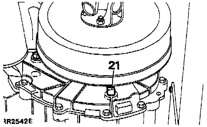 35. Remove the two bolts that are visible through the access holes, which secure the drive plate to the torque converter. Mark one of the access holes and a bolt hole in the converter with an identification line to aid re-assembly and to maintain original build setting.