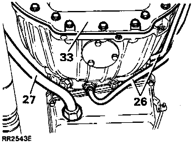 26. Place a suitable container below the transmission, disconnect the oil cooler feed and return pipes from the bottom and side of the transmission. Plug the pipes and openings to prevent ingress of foreign matter.